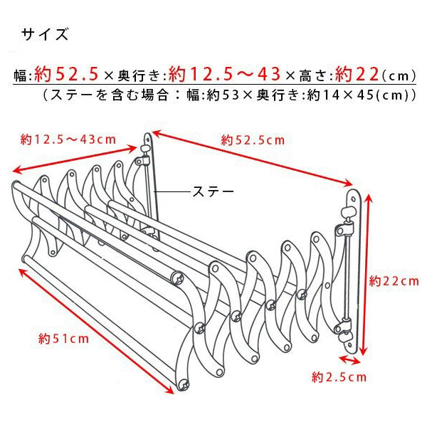 DETAIL サイズ W:約525×D:約125〜430×H:約220(mm) 重量 1.2kg 材質 18/0ステンレススチール 付属品 取り付けネジ 原産国 台湾 備考 最大で5枚のタオルを掛けることができます。